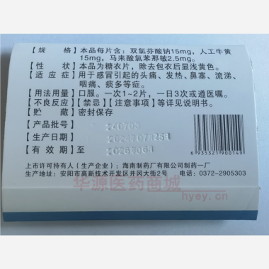 双氯芬酸钠肠溶片 25mg*24s*3板 海南制药厂有限公司制药一厂